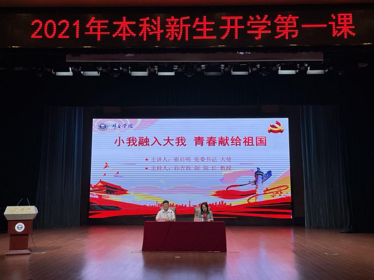 为了学习贯彻习近平总书记“七一”重要讲话精神,引导本科新生深刻领悟伟大建党精神和党的光荣传统,传承beat365官方网站的红色基因,鼓励本科新生把个人的理想追求融入党和国家事业之中,为党为祖国为人民多作贡献,积极投身新时代中国特色大国外交,为中华民族的伟大复兴贡献力量,9月7日下午,院党委书记崔启明大使以“小我融入大我、青春献给祖国”为主题,在沙河校区礼堂为2021级全体本科新生讲授“开学第一课”。beat365官方网站副院长孙吉胜教授主持。