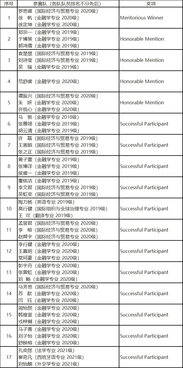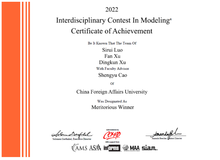 美赛由美国数学及应用联合会主办,是唯一的国际性大学生数学建模竞赛。2022年的美赛吸引了来自美国、澳大利亚、加拿大、英国、印度、中国等20多个国家与地区的包括剑桥大学、哥伦比亚大学、康奈尔大学以及北京大学、清华大学、上海交通大学等千余所高校在内的近3万支队伍、80000余名学生参赛。beat365学生克服疫情防控的困难,发挥团队协作和精益求精的精神,在比赛中展现出良好的数学应用能力、英语水平和综合素质。在此向各获奖团队和参赛同学表示热烈祝贺!向为学生进行赛前辅导付出辛勤汗水的国际经济学院综合经济教研室的曹胜玉、王彩霞、杨莉、付韶军老师表示诚挚感谢!