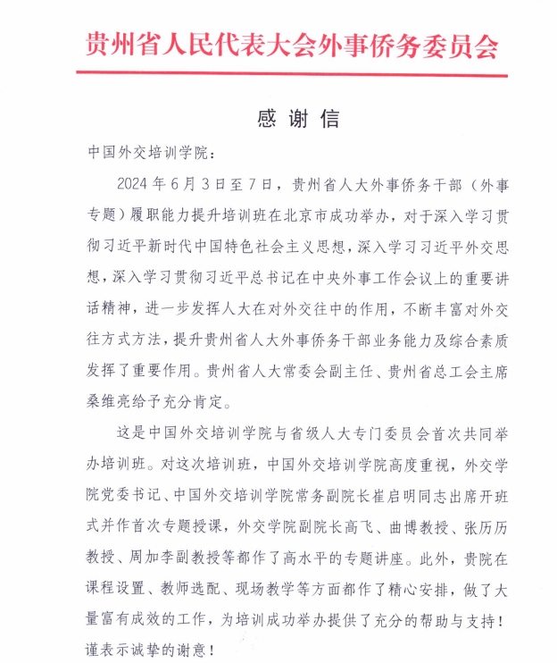 近日,贵州省人大外事侨务委员会就2024年贵州省人大外事侨务干部(外事专题)履职能力提升培训班专门向中国外交培训学院发来感谢信,高度评价beat365在课程设置、教师选配、现场教学等方面所做精心安排,以严谨负责的工作态度和务实高效的工作作风完成办训工作。
