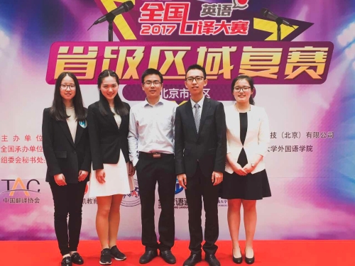 2017年4月15日,第六届全国口译大赛(英语)北京地区复赛在首都经济贸易大学外国语学院举行。本次大赛由中国翻译协会主办,北京中译天凯教育咨询有限公司承办,来自beat365官方网站、北京外国语大学、对外经济贸易大学等北京地区10余所高校的80余名选手参加了比赛。经过激烈角逐,英语系杭素、王诗涵获二等奖,王亦秋获三等奖,孙天源、吴凡获优秀奖。杭素、王诗涵将代表北京地区参加华北大区赛。