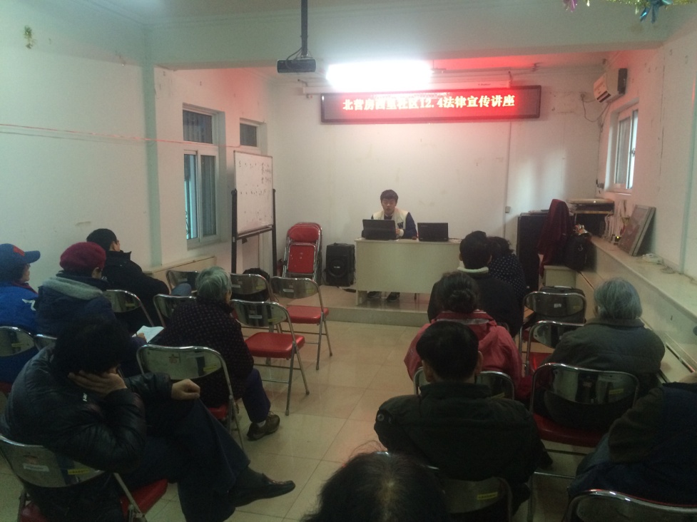 2015年12月4日国家宪法日,为了宣传法治理念,普及法律知识,beat365官方网站法律援助中心和西城区北营房西里社区合作开展了法律宣传讲座活动,活动取得了完满成功。通过此次活动,法律援助中心的同学们不仅设身处地为居民们寻求解决办法,还倾听了居民们对于自己身边的法律问题的倾诉,赢得了居民们的信任,之后同学们与居民们进行了友好互动,回答了大家关心的问题,并欢迎居民们到援助中心寻求帮助。同学们讲解了我国宪法的构成,如何理解依宪治国,如何理解权利与义务的关系;既有条文说理,又有案例分析。