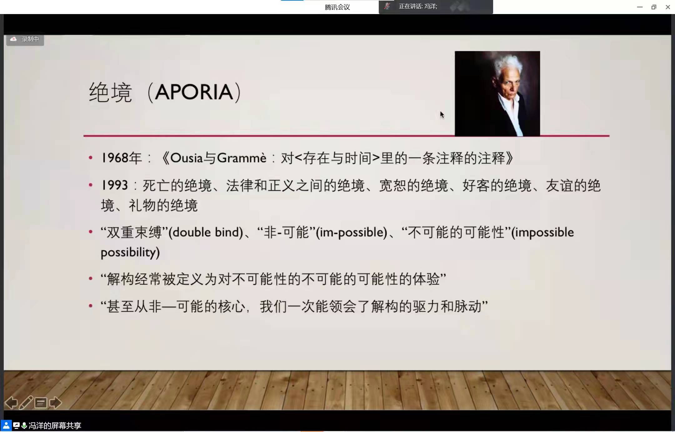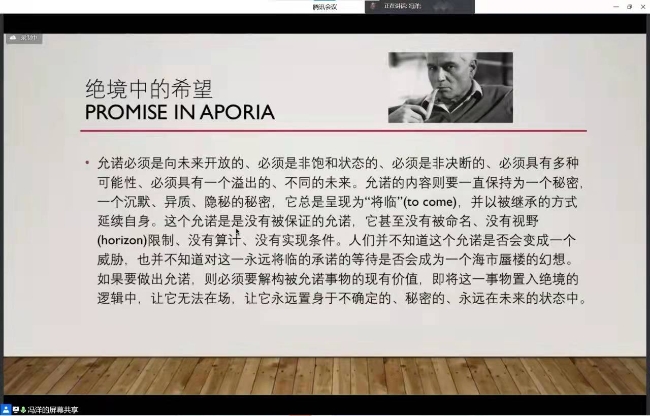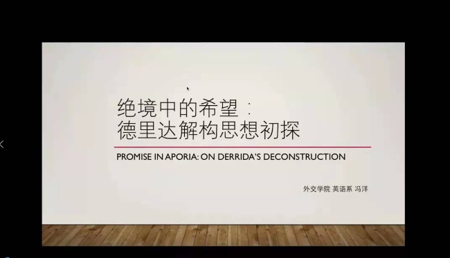 2022年2月16日晚,英语系2021-2022学年寒假线上通识教育工作坊第五期——“绝境中的希望:德里达解构思想初探”主题讲座于腾讯会议线上平台成功举办。本场讲座由英语系冯洋老师主讲,我校英语系的本科生、研究生以及北京协和医学院的研究生参加了本场讲座。