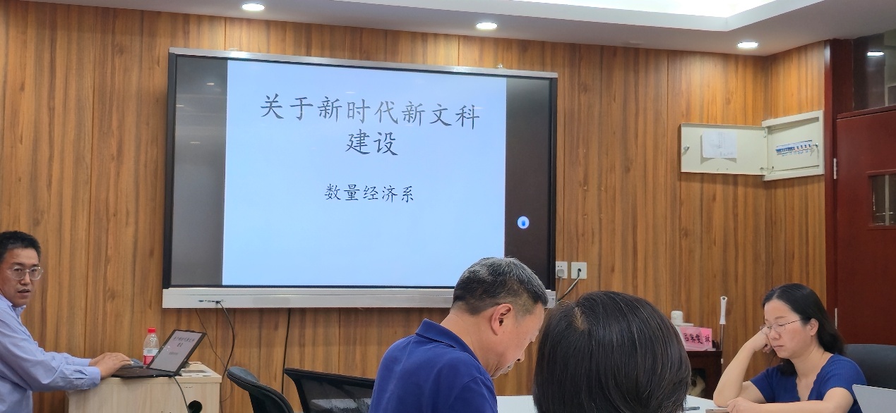付韶军老师则从新时代新文科建设对学生素质的要求出发,提出应着重增强学生的数据分析能力、编程能力、解决实际问题的能力以及现代信息及时有效结合的能力。他结合教研室目前开设的相关课程、组织的比赛,阐述了进一步发展的设想,并针对即将开设的新课程《数字经济学》,分享了自己的开课思路与规划。