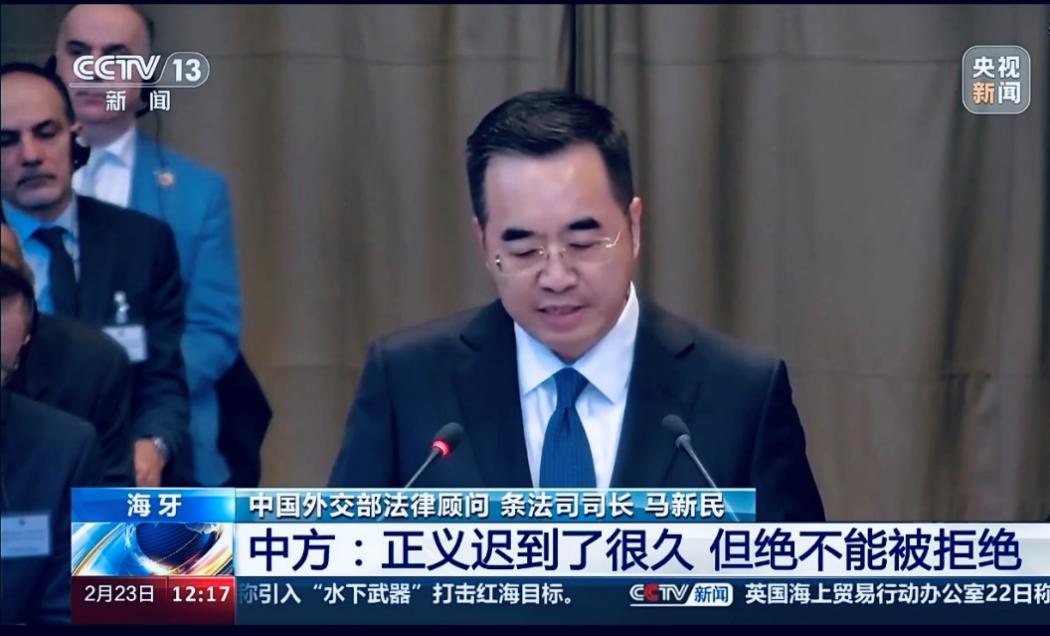 2024年2月22日上午,中国外交部条法司司长马新民向国际法院陈述中方意见,根据联大第77/247号决议提请的法律问题,就国际法院对本案是否具有咨询管辖权和应否发表咨询意见、以色列是否侵犯巴勒斯坦人民的自决权、以色列占领巴勒斯坦领土是否违反国际法等问题全面阐述中国立场、观点和主张。这是中国继2009年参加国际法院科索沃独立问题咨询意见案口头程序之后,第二次参加国际法院咨询意见案口头程序,引起国内外高度关注和热烈反响。