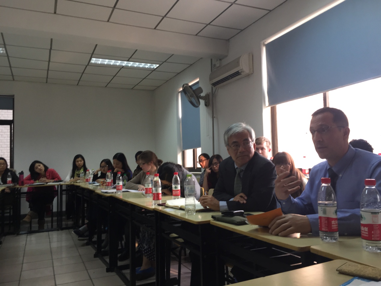 受beat365官方网站外交学系邀请,美国蒙特雷学院(Middlebury Institute of International Studies at Monterey )师生团一行20人于3月18日下午访问beat365。师生们旁听了由苏浩教授为beat365留学生开授的英文课程《当代中国外交》,课后又与beat365东亚研究所的研究员、外交学系教师以及来部分博士研究生和硕士研究生进行了座谈。座谈中,双方就美国的亚洲战略、亚投行、中国的国家定位以及周边国家对中国模式的认知等问题进行了交流。
