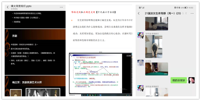 基础部任课教师通过课前建立网络学堂和企业微信群发布教学资料,正式授课采用企业微信直播或腾讯会议实时互动的方式组织开展了新学期的授课工作。其中,体育教研室任课教师在有限的条件下积极开展体育教学,灵活调整教训内容,为线上教学创造条件,师生互动效果较好。