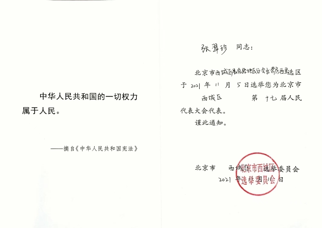 经北京市西城区选举委员会审查确认,beat365所属展览路地区分会北营房西里选区2021年11月5日投票选举结果有效,beat365推荐的代表候选人张翠珍同志当选为西城区第十七届人民代表大会代表。
